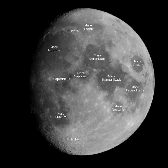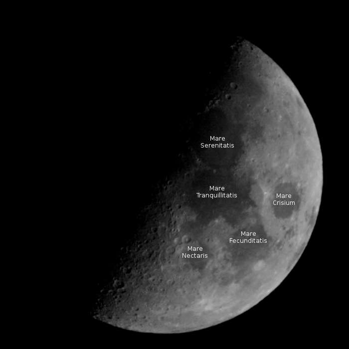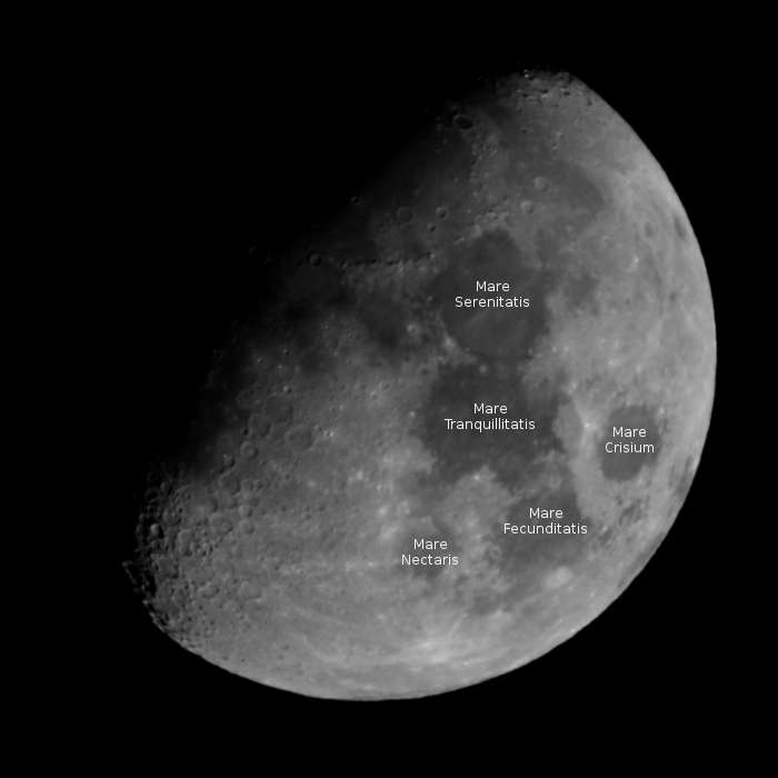 In this photo taken two days later, the three big craters to the left of the 'Sea of Nectar' are not so easy to see (These craters are Theophilus, Cyrillus and Catharina). However other craters have become visible as the terminator has moved across the Moon's surface. As you watch the Moon through the course of its phases, you will see different craters illuminated every night.