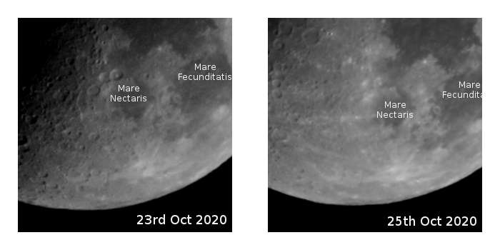 A full Moon rising over a distant horizon is a beautiful sight. The darker rock of the lunar 'seas' is very noticeable, but craters are not so easy to see. Best time to see craters and mountains are when they are near the lunar terminator - the dividing line between the sun-lit and the dark sides of the Moon. In this picture of a first quarter Moon from 23rd October 2020 you can see lots of craters to the left of 'Sea of Nectar'.