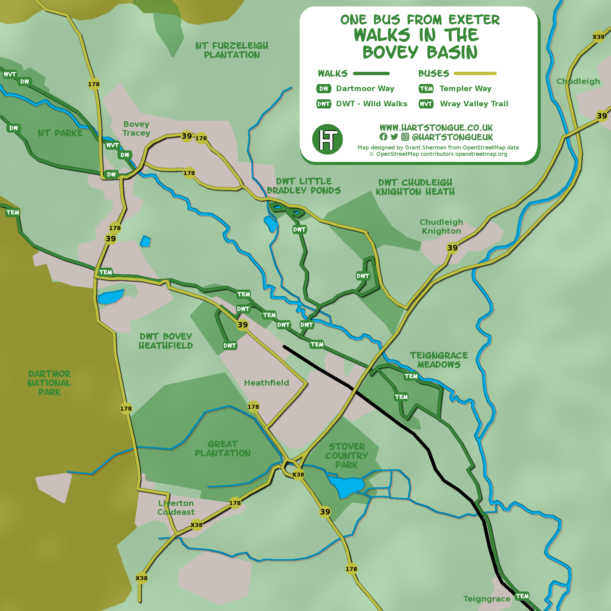 Starts: 2 miles east of Bovey Tracey, Length: 4.5 miles, Highlights include: heather and heathland birds at DWT Bovey Heathfield nature reserve, dragonflies and peaceful ponds at DWT Little Bradley Ponds nature reserve, butterflies and heathland birds at DWT Chudleigh Knighton Heath nature reserve.