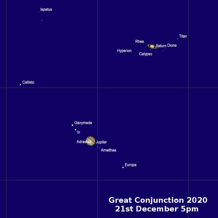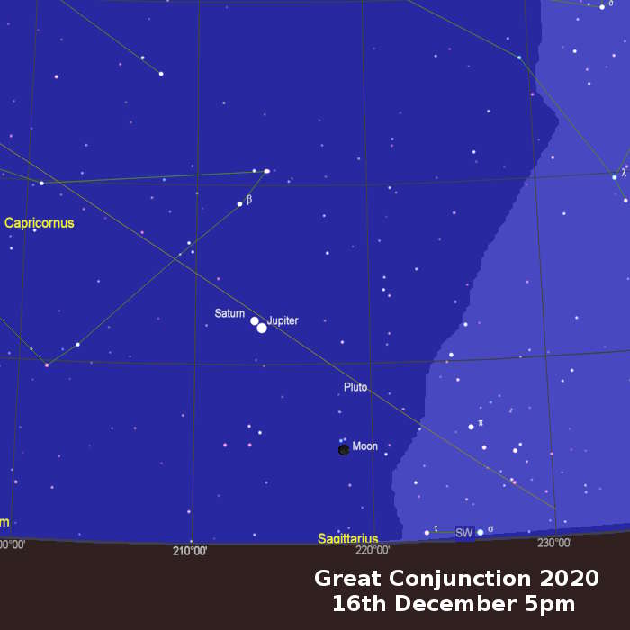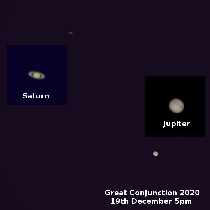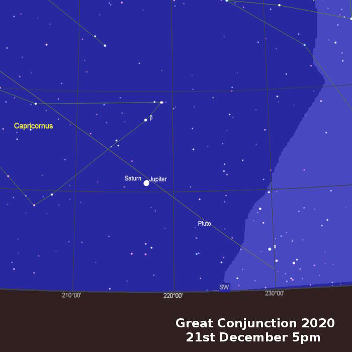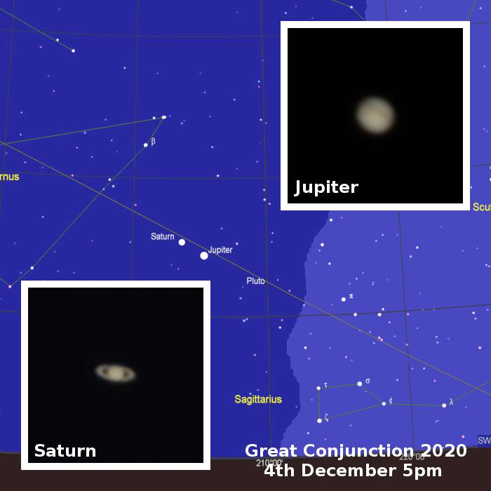 How to see the Great Conjunction The closest approach occurs on the evening of the 21st December just after sunset. Jupiter and Saturn are bright but low near the south west horizon. Start looking for Jupiter on every clear night as we don't know want the weather will be like to the 21st. Here are images of the two planets that I captured on 4th December.