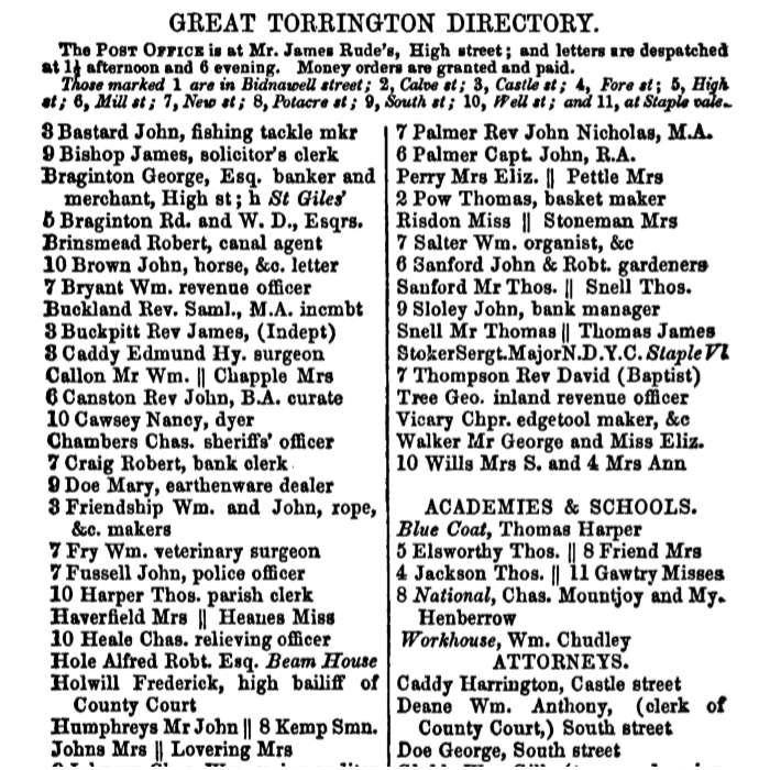 With the 2021 census just completed, lets look at how Great Torrington appeared in previous censuses. The FreeCEN website gives free access to 1841, 1861 and 1891 censuses of Great Torrington. White's Devonshire Directory from 1850 can fill in some gaps. How would your life look to future historians, if they could only read a few lines every 10 years?