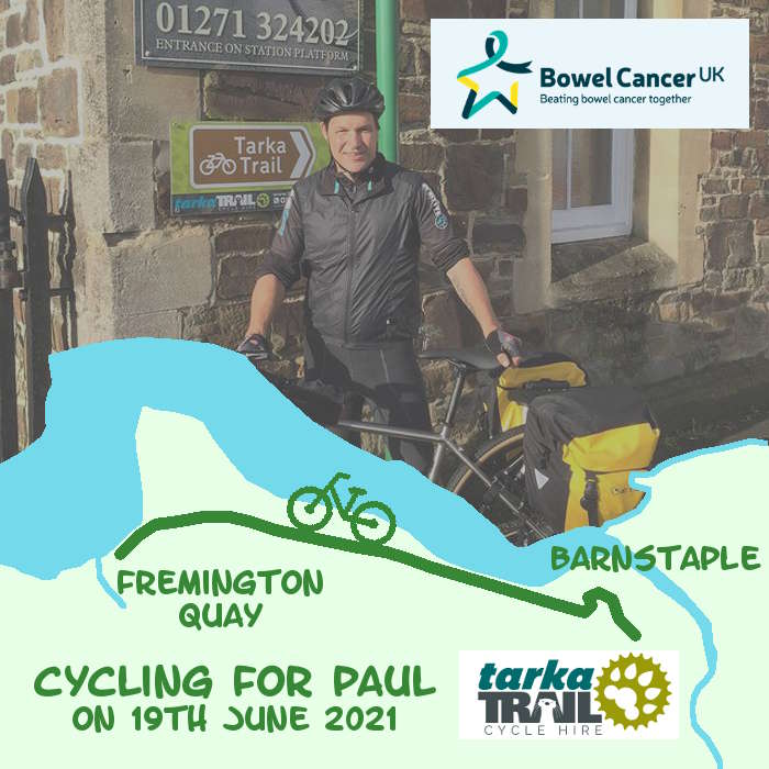 On June 19th, I'm doing a charity bike ride for Bowel Cancer UK to remember Paul. I’ll hire a bike from Tarka Trail Cycle Hire, which is now run by Paul’s nephew. I don’t know how far I’ll ride as I only learnt to ride a bicycle last year (a lockdown challenge from my step-daughter Rachel). I’ll ride to Fremington and back, then see if I can go further.