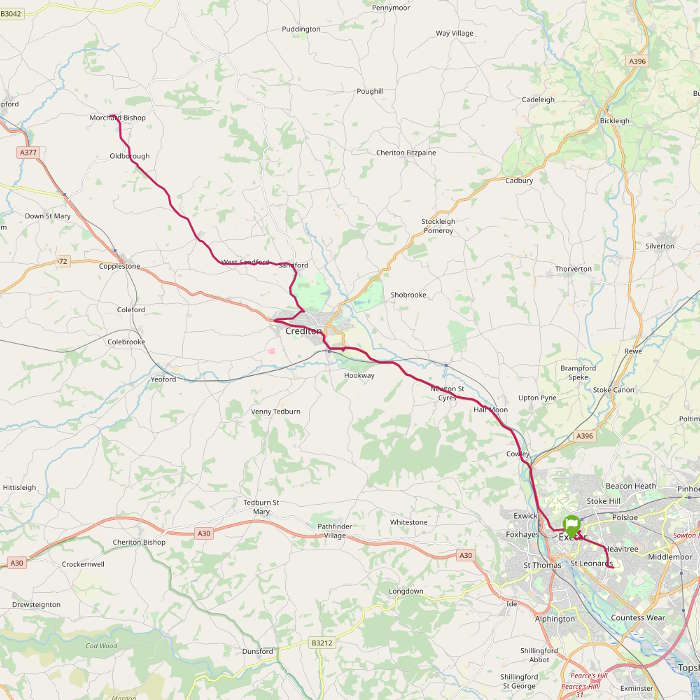Bus Stops: Morchard Bishop Greenaway (SE-bound) - Newbuildings Shelter (SE-bound) - Sandford The Square (SE-bound) - Crediton opp Tesco Metro (Stop B) - Newton St Cyres Crown and Sceptre (E-bound) - Exeter Sidwell Street - Wonford R D & E Hospital (NE-bound)